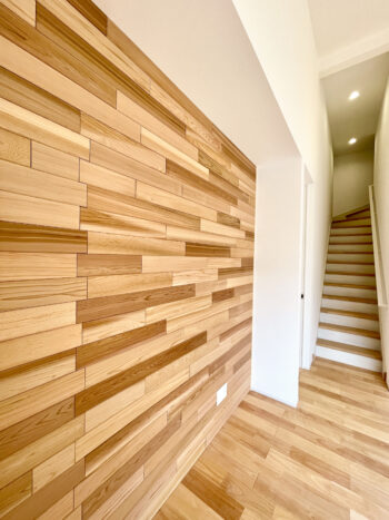 ・壁仕上げ:テレビ背面は無垢パネルを使ったアクセント壁に