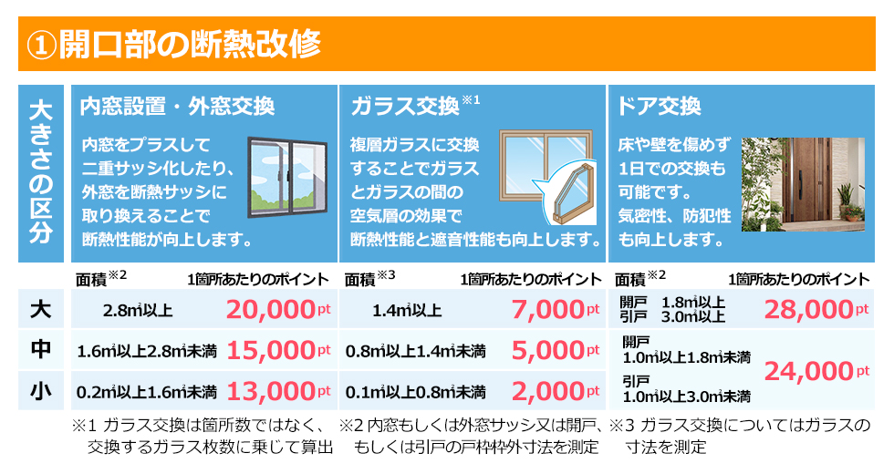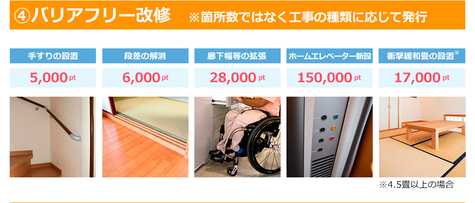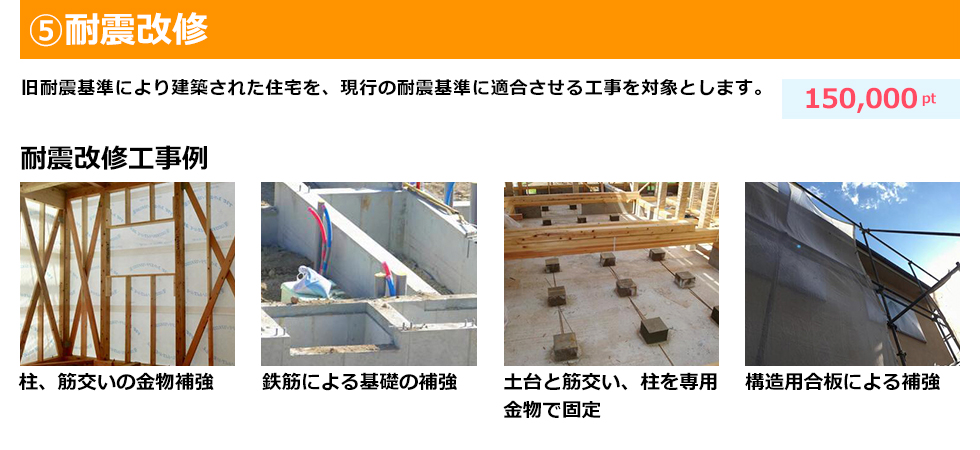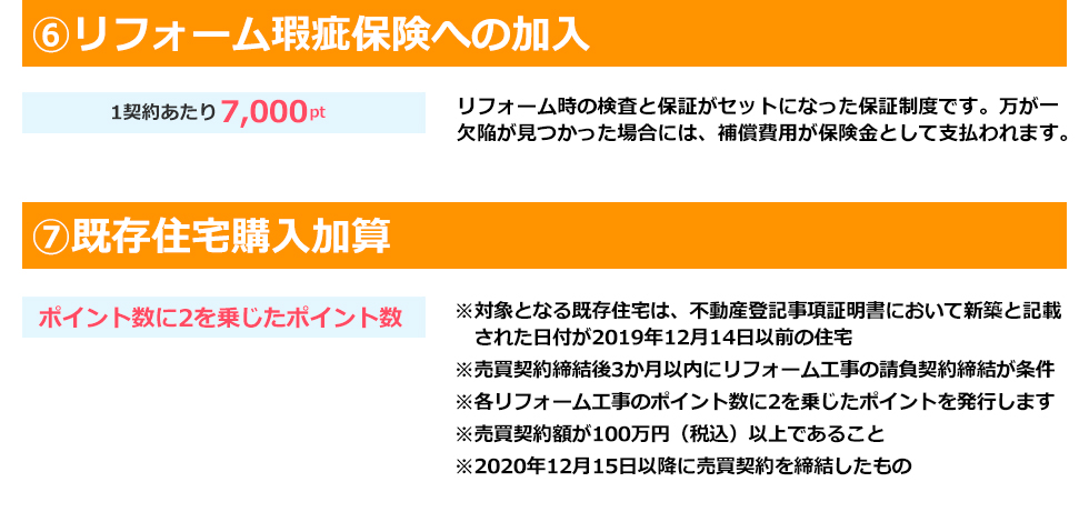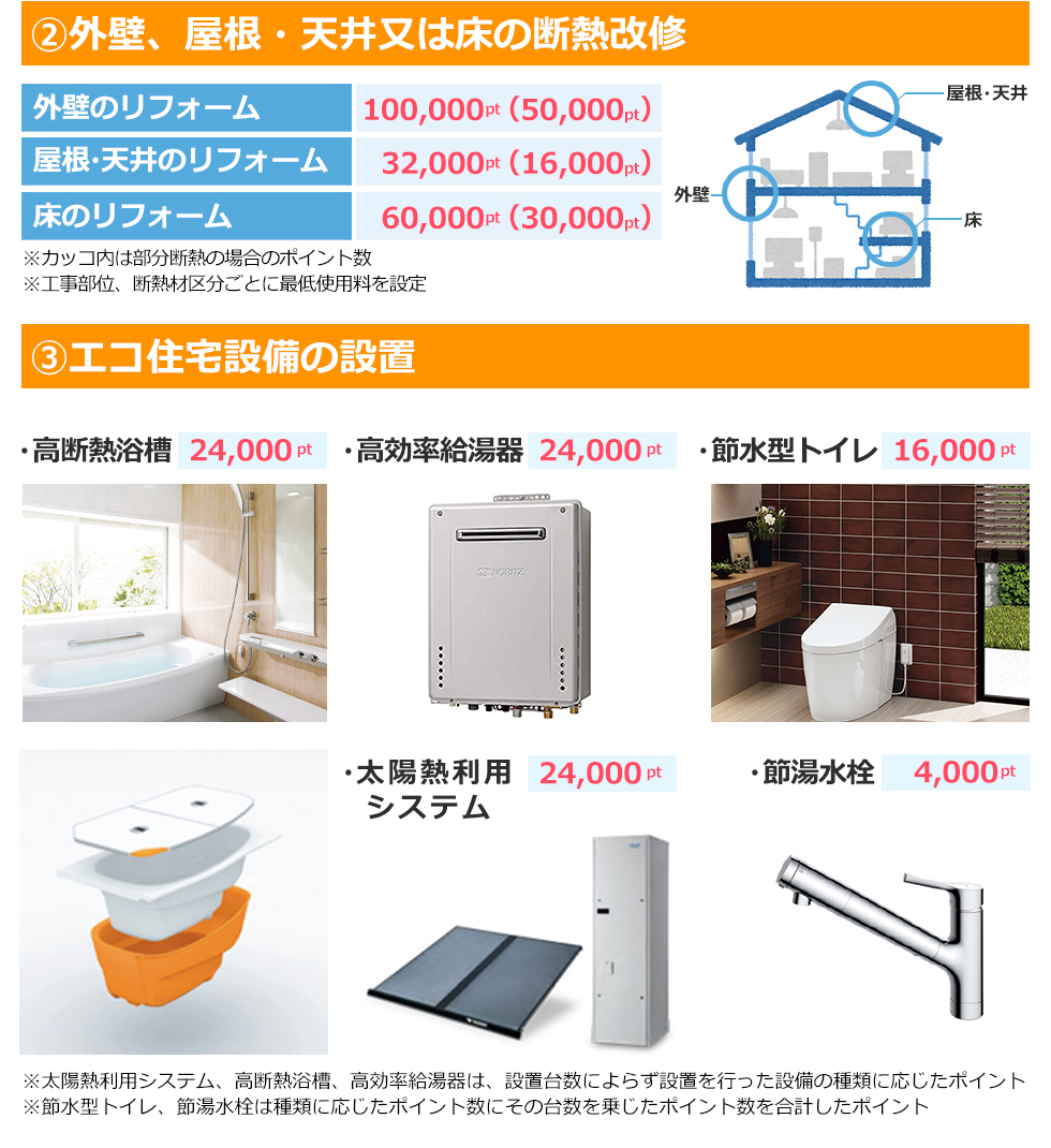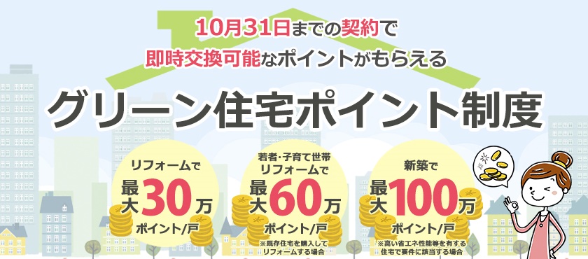 お問い合わせ 資料請求 HOMEグリーン住宅ポイント制度について グリーン住宅ポイント制度について グリーン住宅ポイント制度とは? 一定の省エネ性や耐震性、バリアフリー性能等を満たすリフォームや新築を建てる場合に、在宅ワークなどの「新たな日常」や防災に対応した商品や追加工事、環境や子育て支援等に対応した商品と交換できるポイントを付与する制度です。今回の制度では、取得したポイントで特定の商品へと交換ができるだけでなく、「即時交換工事」といった獲得したポイントを追加工事の費用として使用することができる点が大きな特徴となっています(即時交換は対象となる追加工事に限定されます)特例に当てはまる場合、さらに付与ポイントが引上げられ、新築だと最大100万ポイントが発行されます。ポイント分で通常よりもお得に工事を行うことができますので、制度を有効に活用して快適なお住まいへと工事を行いましょう。 ※本制度の実施は令和2年度第三次補正予算の成立を前提としています。以下の内容は変更がある得ることにご留意ください。※当ページは令和2年12月15日現在の情報を基に制作されています。詳細は国土交通省のホームページをご覧ください。 リフォームで対象となる住宅(持家・賃貸) 対象住宅 上限ポイント(基本の場合) 上限ポイント(特例の場合) ①断熱改修またはエコ住宅設備(必須) ②耐震改修 ③バリアフリー改修 ④リフォーム瑕疵保険等への加入 30万ポイント/戸 60万ポイント/戸 ※特例にあたる条件は、下記いずれかに該当する場合 ①若者(40歳未満)・子育て(18歳未満の子どもがいる)世帯。上限は45万ポイント。既存住宅の購入が伴う場合は上限60万ポイント②①以外の世帯で安心R住宅を購入しリフォームを行う場合、上限が45万ポイントに引上げされます。 新築住宅(建築または分譲住宅) 対象住宅 発行ポイント(基本の場合) 発行ポイント(特例の場合) ①高い省エネ性能等を有する住宅・認定長期優良住宅・認定低炭素建築物・性能向上計画認定住宅・ZEH 40万ポイント/戸 100万ポイント/戸 ②省エネ基準に適合する住宅(断熱等級4かつ一次エネ等級4以上を満たす住宅) 30万ポイント/戸 60万ポイント/戸 ※特例にあたる条件は、下記いずれかに該当する場合・「東京圏(東京都・埼玉県・千葉県・神奈川県※一部地域を除く)からの移住のための住宅」・「18歳未満の子ども3人以上の世帯が取得する住宅」・「三世代同居仕様の住宅」・「災害リスクが高い区域からの移住のための住宅」 既存住宅の購入 ※売買契約額が 100万円(税込)以上のもの 対象住宅 発行ポイント ①下記いずれかに該当・空き家バンク登録住宅・東京圏(条件不利地域を除く)からの移住するための住宅・災害リスクが高い区域からの移住のための住宅 30万ポイント/戸(②を伴う場合は45万ポイント/戸) ②住宅の除却に伴い購入する既存住宅 15万ポイント/戸 賃貸住宅の新築 対象住宅 発行ポイント ①建築主が賃貸用に提供するために新築する共同住宅等で、高い省エネ性能(※賃貸住宅トップランナー基準に適合)を有する、すべての住戸の床面積が40㎡以上の賃貸住宅 10万ポイント/戸 制度の対象期間 グリーン住宅ポイント制度の対象期間は限られており、2020年12月15日から2021年10月31日までの期間内に申請を完了したものが対象となります。(最初の契約(原契約)を締結した日とし、変更契約は対象になりません) ※2021年10月5日より申請期限の延長がされました。 郵送・窓口での申請は2021年11月30日まで オンラインでの申請は2021年12月15日(追加工事交換を伴う完了前申請の場合は、2021年11月30日)となります。 ※予算の執行状況により、早期終了となる場合があります。※ポイント発行申請は原則として工事完了後に行います。※工事請負契約額が1,000万円(税込)以上のリフォームは、工事完了前であってもポイント発行申請可能です。詳しくはお問合せ下さい。 ポイントで交換できる商品・工事 グリーン住宅ポイントと交換できる商品・工事共に、新型コロナウイルスの影響から「新しい生活様式」を意識したものが対象となります。 「子育て支援、働き方改革」の項目から時短につながるアイテム(家電など)など、具体的な内容については準備が整い次第発表される予定です。 ※具体的な交換可能な商品などの情報が出次第随時更新をしていきます。 下記に資する商品 ①「新たな日常」に資する商品 ②省エネ・環境配慮に優れた商品 ③防災関連・健康関連商品 ④家事負担の軽減・子育て関連商品 ⑤地域復興に資する商品 追加工事 「新たな日常」(テレワークや感染症予防)及び「防災」に対応した追加工事 ※住宅の新築(賃貸)は追加工事のみ ポイント交換申請期間 ・商品交換の場合:準備が整い次第~2022年1月15日(予定) ・追加工事の場合:準備が整い次第~2021年10月31日(予定) ※2021年10月5日より商品交換申込期限が2022年2月15日に延長がされました。 対象となるリフォーム工事のポイント数 1戸あたりの発行ポイント数は